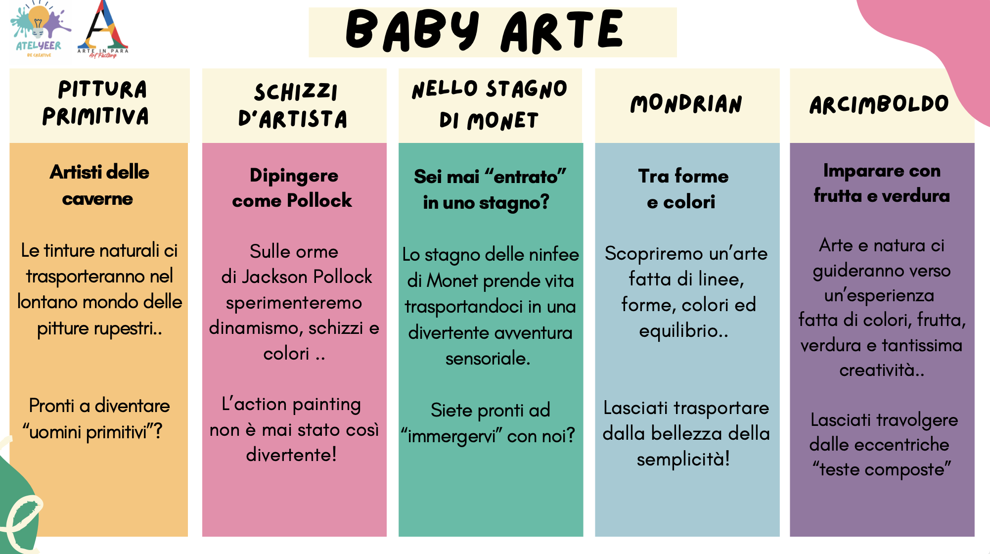 Ogni incontro sarà un momento di gioia e condivisione, conosceremo artisti importanti e i loro coloratissimi lavori per muovere insieme i primi passi nel mondo dell’arte.